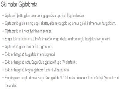 Skilmála þessa árs má sjá hér til hliðar en ólíkt fyrri „tilboðum“ eru engar hömlur á áfangastöðum og engar hömlur heldur á ferðatíma að því gefnu að nota verður bréfið á næstu tveimur árum. Það töluvert liðlegra en árið 2012 þegar ferðatími var takmarkaður við fáeina mánuði og flug þurfti að bóka strax á nýju ári.