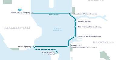 Slíkt finnur þú til dæmis með því að gúggla East River Ferry Cruise. Ólíkt túristasiglingunum er þessi dallur hluti af samgöngukerfi borgarinnar sem skýrir lágt verðið. Og eins og sjá má á meðfylgjandi korti er ferjan atarna að stoppa á sérdeilis heppilegum stöðum ef hugmyndin er að sjá Manhattan í heild sinni.