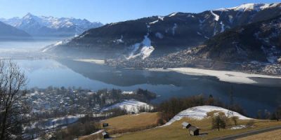 Hinn vinsæli bær Zell Am See í Austurríki á hádegi þann 2. janúar 2017. Snjór af verulega skornum skammti. Skjáskot