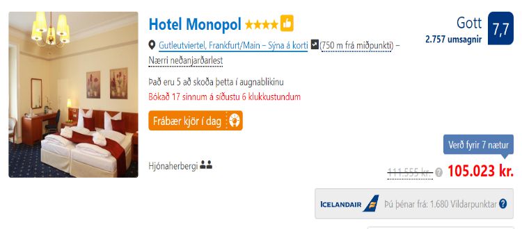 Vinsælt hótel í Frankfurt í Þýskalandi. Verð hjá Icelandair vía Booking fyrir sjö daga í maí reynist 105.023 krónur á „sérstaklega frábærum kjörum.“