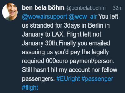 Eitt slíkt dæmi má sjá hér að ofan. Flugi Wow Air frá Berlín í janúar aflýst með tilheyrandi veseni fyrir þá tæplega tvö hundruð sem áttu bókað í flugið. Tæpum FJÓRUM MÁNUÐUM síðar hefur ekki eyrir skilað sér í skaðabætur til þeirra sem hlut áttu að máli!!!