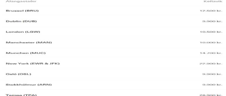 „Verðið hjá okkur lækkar samferða birtunni, Brussel, Dublin, London, Manchester, Munchen, New York, Osló, Stokkhólmur og Tampa bíða þín. Verð aðra leið frá 9.900 kr. á Economy Light eða frá 15.300 vildarpunktum.”