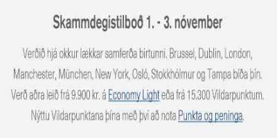 Skoðaðu skjáskotið hér til hliðar. Þar kynnt nýjung hjá Icelandair sem kallast skammdegistilboð og stendur fyrir lægri fargjöld en almennt til ýmissa áfangastaða.