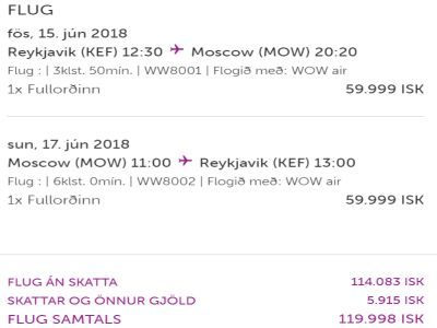 Þrátt fyrir að á forsíðu íslensks vefs Wow Air sé tilkynnt að hægt sé að kaupa flug fram og aftur til Moskvu í júní fyrir svo lítið sem 99.999 krónur á sardínufarrými með ekkert innifalið, reynist það ekki vera raunin þegar farið er inn á bókunarvél Wow Air. Þar hækkar sami miði umsvifalaust um 20 prósent og kostar að lágmarki 120.997 krónur fyrir manninn á sama sardínufarrými án alls.