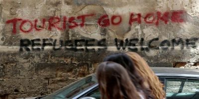Graffíti í götu í Feneyjum segir allt sem segja þarf. Þar stendur: Út með ferðamenn, flóttamenn velkomnir.