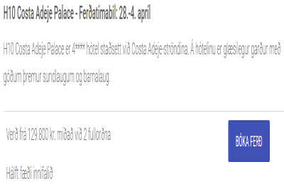Þeir kalla þetta sérstakt jólatilboð. Vika fyrir tvo með hálfu fæði á góðu fjögurra stjörnu hóteli á Costa Adeje frá 28. mars til 4. apríl næstkomandi. Þó ekki meira „jólatilboð“ en svo að við finnum sama pakka rúmlega 40 þúsund krónum ódýrari.