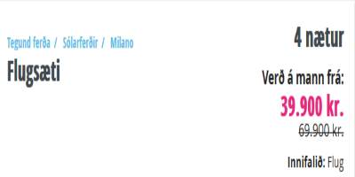Það eru Heimsferðir sem eru að bjóða sæmilegt tilboð til Mílanó milli 4. og 8. apríl næstkomandi í beinu flugi. Prísinn á fluginu fram og aftur með töskudruslu aðeins 39.900 krónur eða tæplega 20 þúsund kall hvora leið.