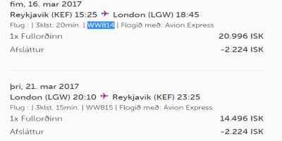 Flug Wow Air til London og heim aftur í marsmánuði. Alls ókunnugt flugfélag að sjá um flugin á eldgömlum vélum. Skjáskot