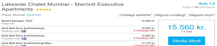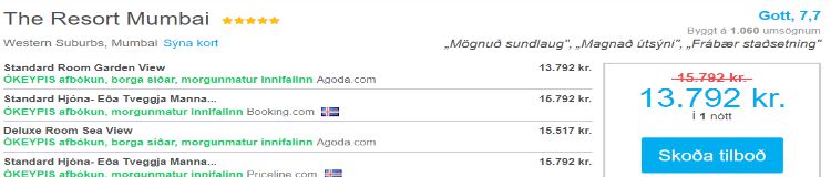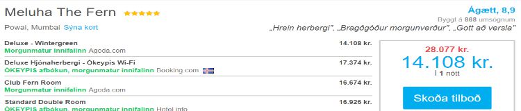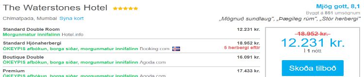 Gúgglaðu fjögurra stjörnu gistingu hér á Íslandi. Ef heppnin er með þér finnurðu herbergi kringum 20 þúsund kall utan annatíma. Gúgglaðu fimm stjörnu gistingu í Mumbai á Indlandi á annatíma og þú getur sloppið með að punga út þrettán þúsund krónum.