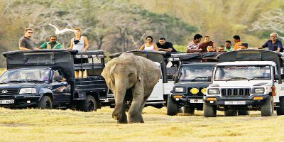 Raunveruleikinn þessi. Í hvert sinn sem tignarlegt dýr sést í Yala-þjóðgarðinum æða 500 jeppar á sama staðinn.