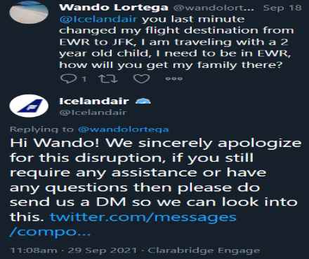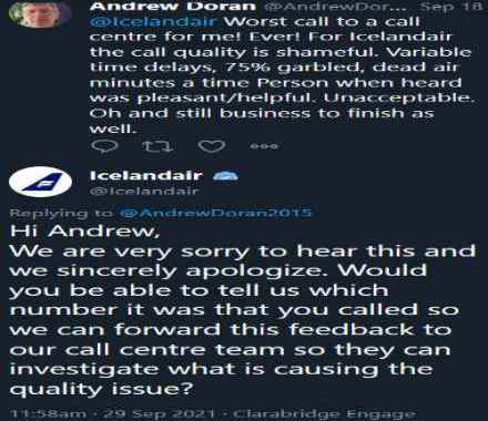 Það fyrirtæki tekur sér þessi dægrin upp undir TÓLF DAGA að svara örvæntingarfullum viðskiptavinum á samfélagsmiðlum. Sem segir sig sjálft að hjálpar viðskiptavinum ekki nokkurn skapaðan hlut enda skeytin fljótari að berast með farskipum og bréfdúfum.