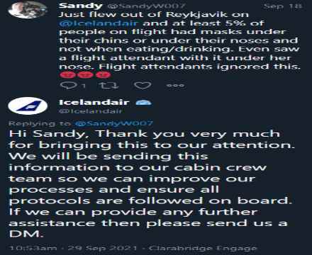 Dæmi um þetta má sjá á meðfylgjandi skjáskotum hér að ofan og til hliðar og dæmin eru mun fleiri á samfélagsmiðlum. Þar sést glögglega að allnokkrir viðskiptavinir voru í stressi og töluverðum vandræðum þann 18. september. Flugfélagið hins vegar ELLEFU DAGA til að gera svo mikið sem svara og jafnvel þá eru svörin mikið til yfirborðskennd þvæla.