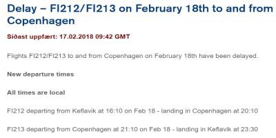 Ók, tafir geta orðið hjá bestu flugfélögum og gott mál að vara við í tíma. En gallinn sá að Icelandair hefur ekkert haft fyrir að láta Keflavík vita af snarbreyttri áætlun til og frá Köben. Hvergi finnst stafur á brottfarartöflu Keflavíkurflugvallar um flug FI212 þann 18. febrúar.