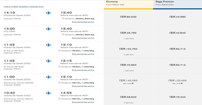 Eins og við sjáum hér að neðan á lægsta verð á flugi heim á leið frá París í júlí að vera 21.090 krónur á sardínufarrými. En það er sama hvað við skrollum fram og aftur eða upp og niður, hvergi finnst lægra verð en 25.790 krónur. Sem er hvorki meira né minna en 22 prósent hærra verð en gefið er í skyn.