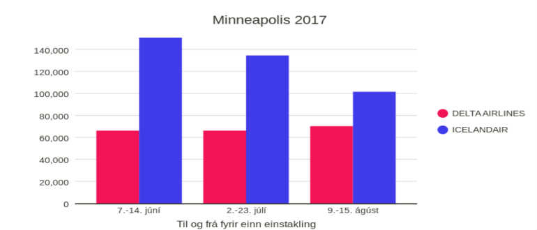 Einhvers staðar á farsæla Fróni myndi fólk aldeilis tryllast á samfélagsmiðlum yfir 123 prósenta verðmun á sömu eða svipaðri vöru. Það er akkurat mesti verðmunurinn á flugi með Icelandair annars vegar og Delta Airlines hins vegar til Minneapolis og heim aftur í sumar.