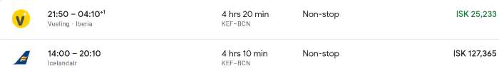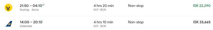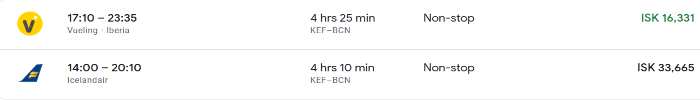 Síðasta dæmið er vitaskuld absúrd en einbeitum okkur að fyrri dæmunum tveimur. Sama flugið, sömu kjör, sömu sæti, sami handfarangur. Meginmunurinn sá að Vueling flýgur að næturlagi en Icelandair yfir hádaginn og fer auðvitað eftir hverjum og einum hvor kosturinn er vænlegri.