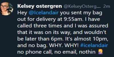 Og svo þetta hér til hliðar. Flugfarþegi fær ekki farangur við komu til landsins. Flugfarþeganum lofað farangrinum upp úr klukkan tíu um morguninn. Tíu klukkustundum síðar er farangurinn enn ekki kominn til eigandans þrátt fyrir fjölda símtala og loforða Icelandair.