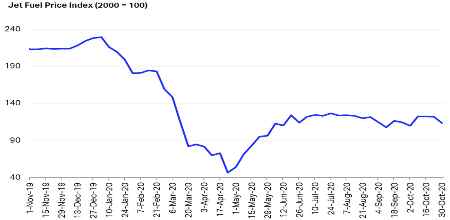 Verðþróun á þotueldsneyti. Það helmingi lægra nú en það var í mars síðastliðnum. Skjáskot IATA