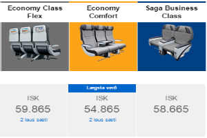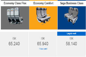Fararheill hefur á flakki um bókunarvef Icelandair; bókunarvef sem nýlega var uppfærður og stífbónaður, rekist á eitt og annað undarlegt. Til dæmis að Saga Class pakkinn er stöku sinnum í boði á lægra verði en sæti á lakari farrýmum. Við látum tvo dæmi hér að neðan fylgja svona ef einhver dregur orð okkar í efa.