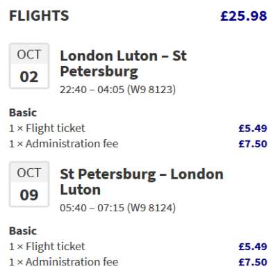 Halelújah hvað það er brilljant verð alla leiðina til Rússlands og heim aftur. En staðreynd engu að síður ef þú leitar vel og lengi á vef ungverska lággjaldaflugfélagsins Wizz Air. Eins og sjá má á meðfylgjandi skjáskoti kemst fólk frá London og til Pétursborgar og sömu leið til baka í október næstkomandi fyrir sömu upphæð og það kostar að kaupa bleyjur og þvottaefni í Bónus. Heilar fimm þúsund krónur eða svo.