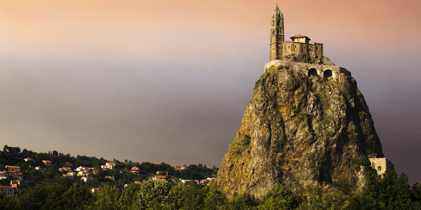 Leiðin til Guðs er þyrnum stráð segir biblían og kannski var það fyrirmynd kirkjunnar í franska bænum Aiguilhe. Þeir plöntuðu sínu heilagasta húsi á toppinn á 79 metra háum kletti og þangað aðeins komist upp og niður 300 tröppur. Mynd Art History Images