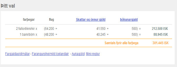 Með tilliti til að Icelandair gefur upp rúmlega 301 þúsund króna kostnað við ferð til Spánar umrædda daga í desember og janúar hefur þriggja manna fjölskyldan þegar sparað sér rúmar 167 þúsund krónur og eru samt að greiða aukalega fyrir farangur. Galinn munur.