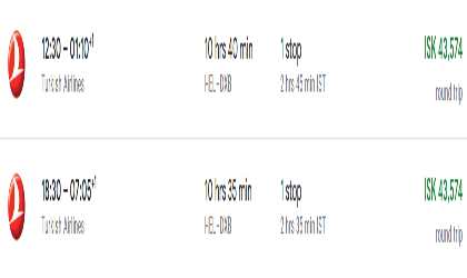Túrinn til Helsinki og heim kostar 28 þúsund krónur en frá Helsinki til Dúbæ og sömu leið til baka greiðir einstaklingur aðeins 43 þúsund krónur. Tæknilega er hægt að stoppa stundarkorn í Istanbúl á leiðinni ef fólk svo kýs.
