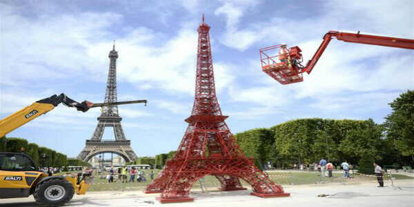 Þetta er ekkert grín. Það er raunverulega verið að byggja nákvæma eftirlíkingu af Eiffel turni úr stólum. Nánar tiltekið hinum velþekktu Fermob stólum sem finna mátt hefur á frönskum kaffihúsum og víðar en það um áratugaskeið.