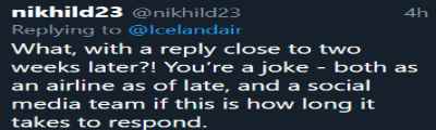 Eða hvað skal halda um flugfélag sem svarar ósáttum viðskiptavini ÞRETTÁN DÖGUM eftir ósk um aðstoð á samfélagsmiðlum? Það er líklega fljótlegra að senda handskrifað bréf með bréfdúfu til Icelandair og fá aðstoð þannig en að nota nútímatækni. Og hér um að ræða fyrirtæki sem hefur reitt sig á feita ríkisaðstoð um margra ára skeið.