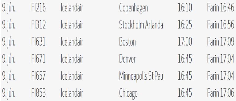 Flugfélagið Icelandair hins vegar getur ekki fyrir nokkurn mun verið á réttum tíma þó fyrirtækinu sé beinlínis borgað fyrir. Enn ein ástæða til að henda forstjóra Icelandair Group á haugana. Hann ræður ekki við nokkurn skapaðan hlut eins og meðfylgjandi skjáskot frá 9. júní bera með sér. Ekki halda eitt augnablik að þessi dagur sé einsdæmi. Þvert á móti er haldið partí í flugturninum í Keflavík í hvert sinn sem vél Icelandair fer í loftið á réttum tíma.