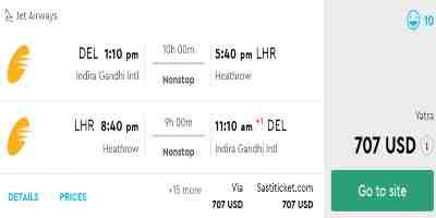 Í desembermánuði er hægt að finna fargjöld frá Nýju-Delí til London og til baka lægst niður í 75 þúsund krónur eins og sjá má hér að ofan. Algengt að finna ferðir milli 80 og 85 þúsund á einstakling. Ofan á það bætast þetta 40 þúsund krónur fyrir flug vestur um haf og til London aftur. Algengt verð því kringum 120 þúsund alls.
